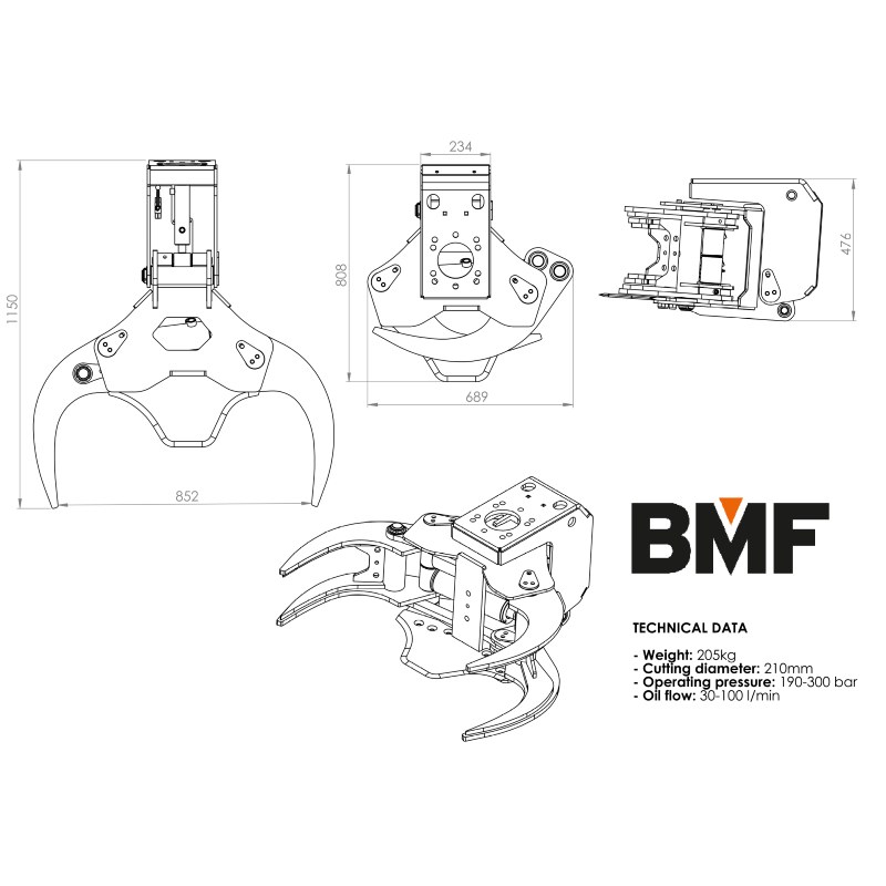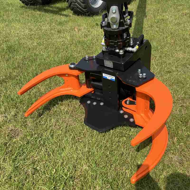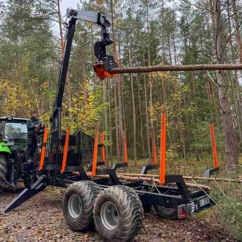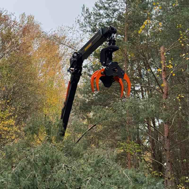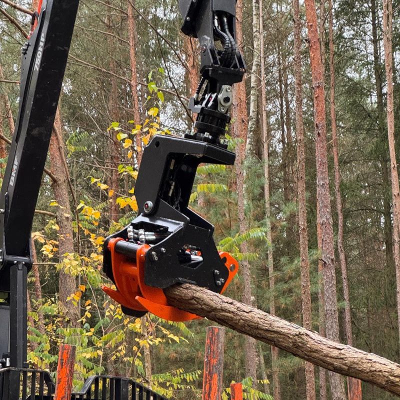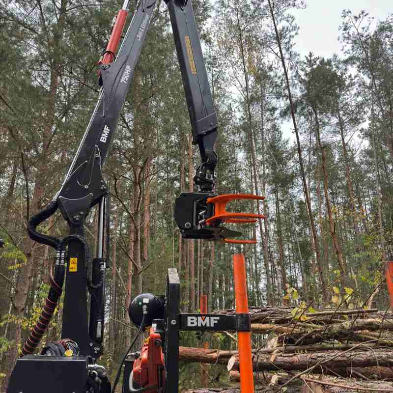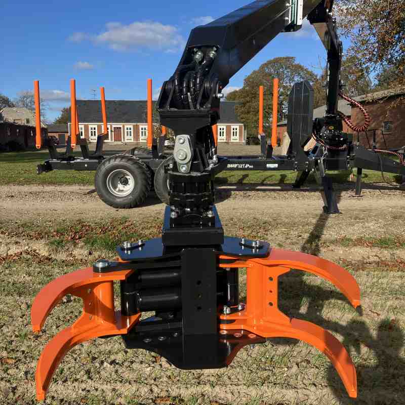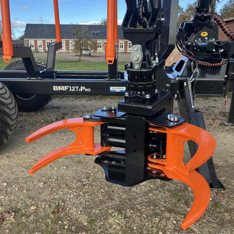 BMF fældegrabben er bygget til montering på skovvognens kran. På den måde kan du fælde og læsse i samme omgang.