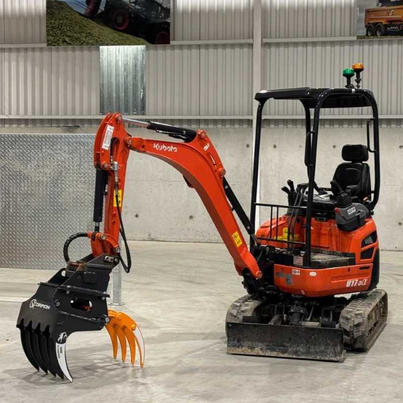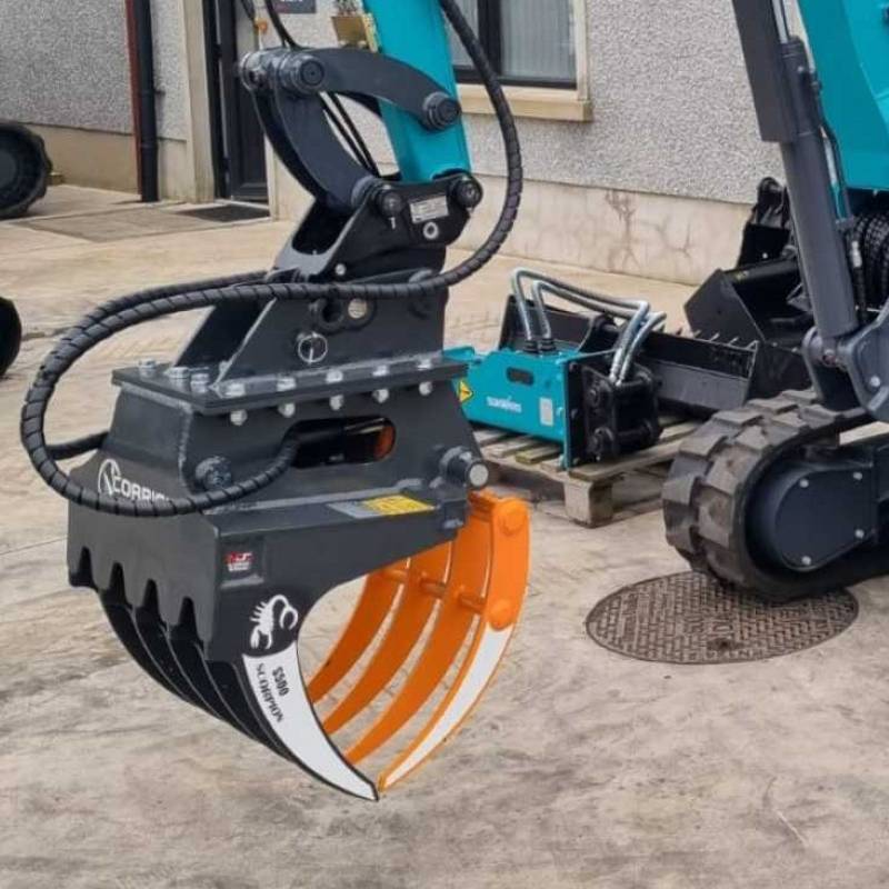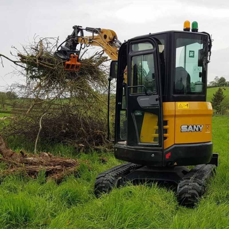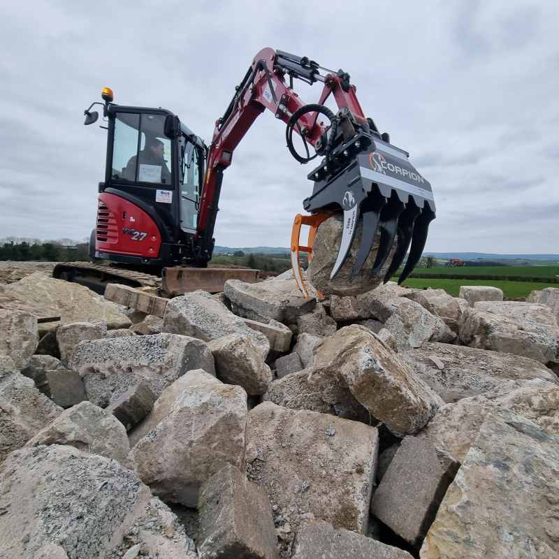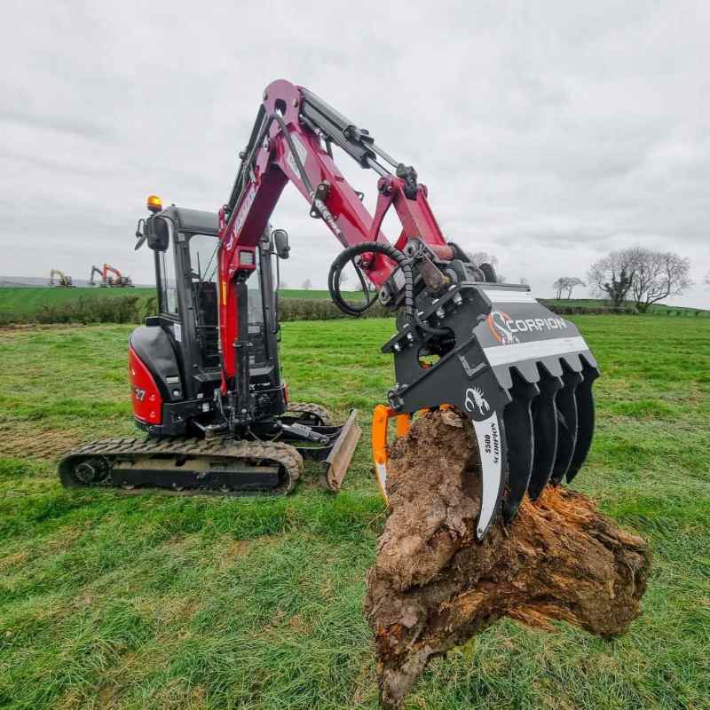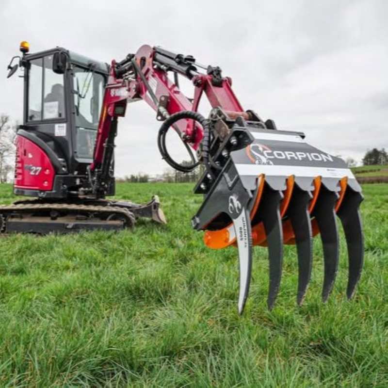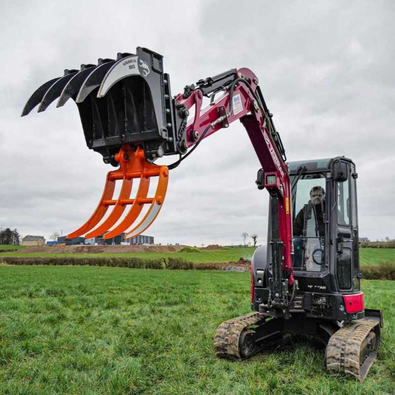 Den mindste rydningsgrab fra MDE Machinery til maskiner fra 1,5-4 tons. Ideel til rydning og klargøring af grønne områder, hvor den fjerner sten, rødder, grene, mindre træstammer mm og samtidig kan udjævne jorden efterfølgende.